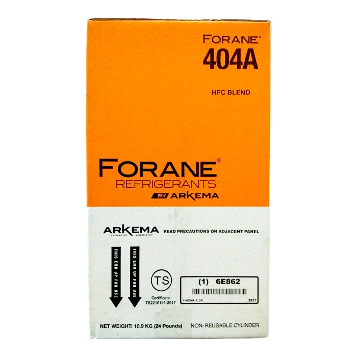 Forane® 404A is a refrigerant blend of three eco-friendly HFCs: R-125, R-143a, and R-134a. It works well with R-502 equipment and is suitable for many cooling needs. Forane® 404A is the preferred choice for new and existing refrigeration systems that require medium and low temperature performance, such as food displays and storages, cold rooms, ice machines, transportation, and process cooling.